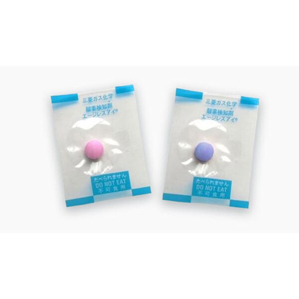The Ageless Eye Oxygen Indicator is an in-package monitor which indicates the presence of oxygen at a glance as the indicator changes from a pink to blue color.