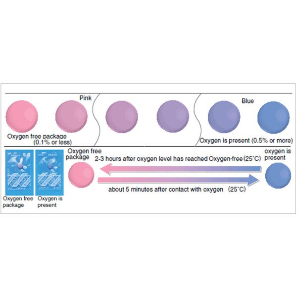 When exposed to oxygen, the Ageless Eye turns from pink to blue or purple, then returns to its original pink color as the oxygen in the sealed package is reduced. The lower the temperature, the slower the color change on the indicator. The color change is reversible, and Ageless Eyes can be reused up to four times.