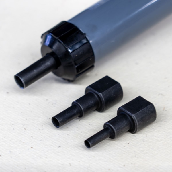 The tool has a plastic body with interchangeable hollow point drill bit tips. After a drill bit tip is added to the body, it is used by putting pressure on the material to be cut and rotated by hand like a door handle to create a drilling action through the material. The drill bits have straight sides, so they do not create larger holes as the penetrate into thick materials.